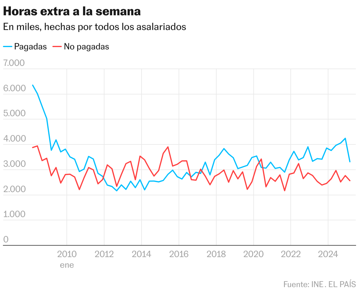 También es relevante el número total de horas extra y cuántas de ellas se abonan y cuántas no. En el primer trimestre de 2025, los asalariados españoles hicieron 3.316.000 millones de horas extra pagadas a la semana y 2.566.000 impagadas, lo que deja la parte no abonada en el 43,6% del total, algo más que un año antes (41,2%), pero tres puntos menos que en el mismo periodo de 2019 (46,4%).