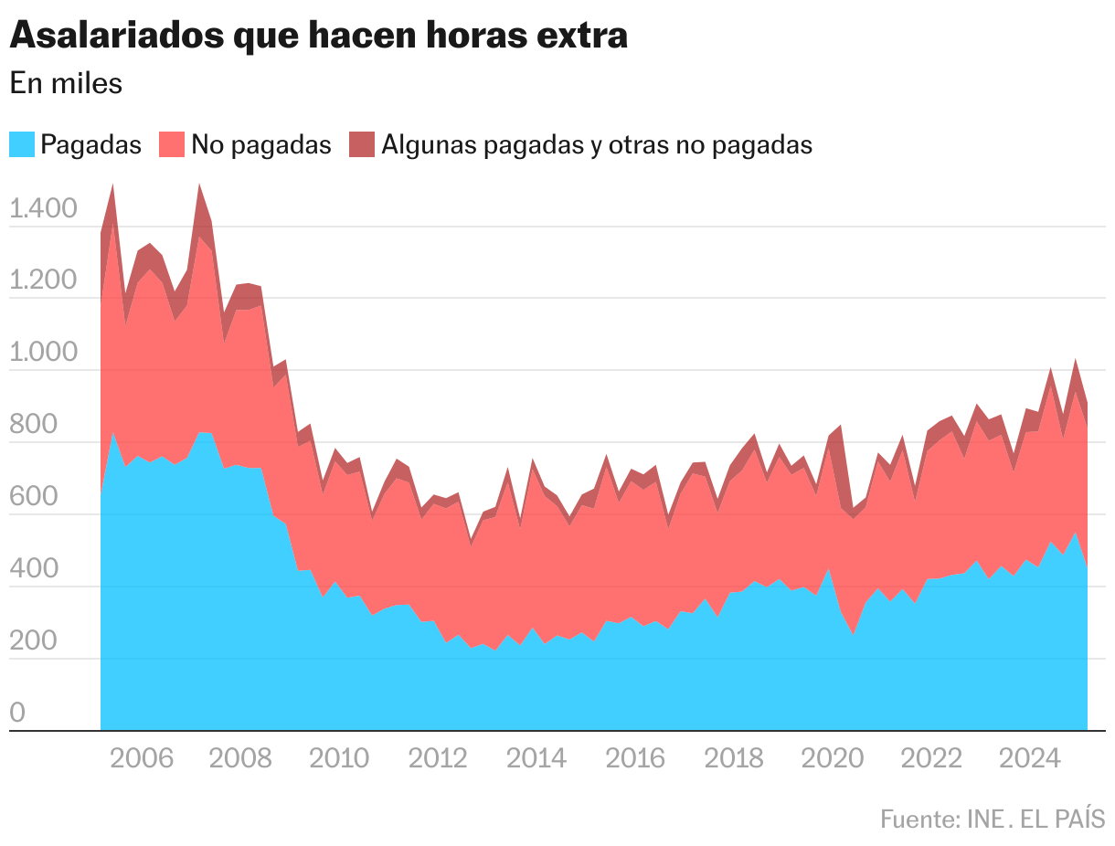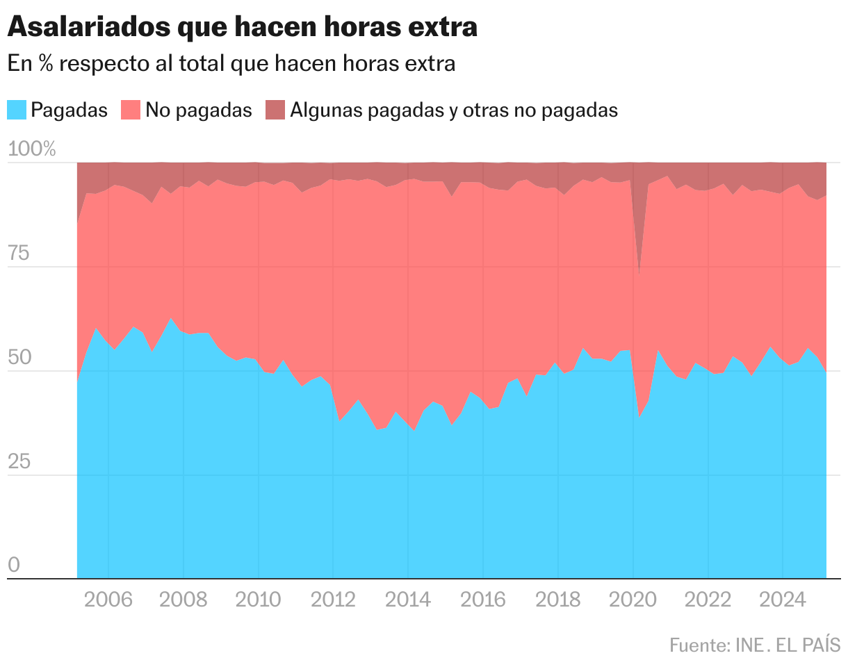 Esta proporción es una suma de dos grupos que el INE identifica por separado: los que no cobran ni una de sus horas extra y los que hacen horas extra tanto pagadas como impagadas. Según el último registro del INE, el 42,6% de los asalariados españoles son del primer grupo (no cobran por sus horas extra) y el 7,9% del segundo (cobran solo una parte). A la vez, 450.200 asalariados sí cobran sus horas extra, el 49,5% de los que estiran sus jornadas ordinarias.