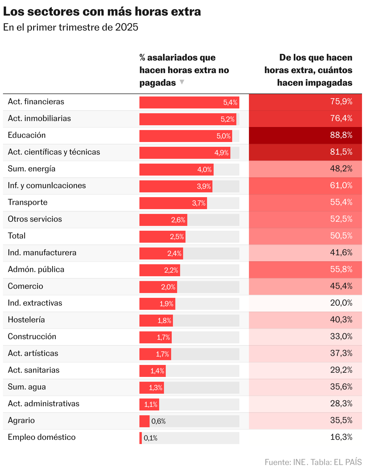 Por sectores, los que tienen mayor proporción de asalariados que hacen horas extra impagadas son las actividades financieras (5,4%), las inmobiliarias (5,2%), la educación (5%) y las actividades científicas y técnicas (4,9%). En el otro lado de la balanza están empleo doméstico (0,1%), el campo (0,6%), las actividades administrativas (1,1%) y el suministro de agua (1,6%).
