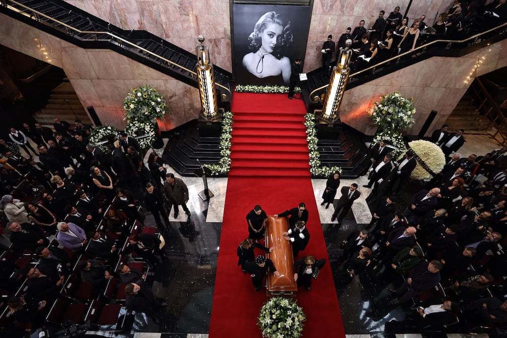 El féretro que contiene los restos de Pinal permaneció en la sala principal del magnífico palacio durante poco más de dos horas, decorado con grandes fotografías de la diva en distintos momentos de su vida.