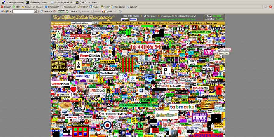 1. La Página del Millón de Dólares. Se trata de un novedoso y sencillo sitio web de anuncios publicitarios creado en el 2005 por un joven de 21 años llamado Alex Tew, con el propósito de recaudar dinero para sus estudios universitarios. Originalmente conocido en inglés como The Million Dollar Page, esta página web fue ideada para que cada pixel de la misma costara un dólar.