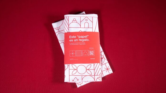 Normmal está reduciendo su impacto medioambiental durante el periodo navideño introduciendo un “papel de regalo” reutilizable elaborado con tejido de algodón orgánico reutilizable.