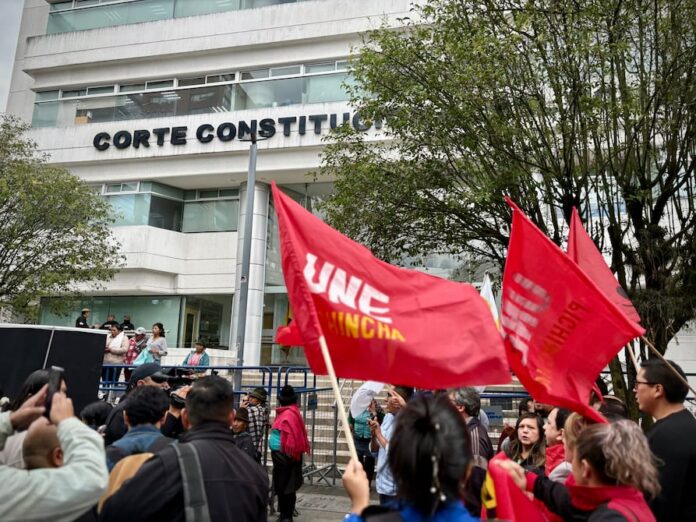 Con banderas y pancartas, los representantes de los gremios de trabajadores y educadores se concentraron en los exteriores de la Corte Constitucional, en el norte de Quito, pasadas las 16:00.
