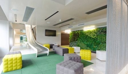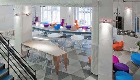 Oficinas de Microsoft en Viena. (Imagen de: inc.com) Oficinas de Microsoft en Viena. Las últimas oficinas en la capital de Austria de la compañía fundada por Bill Gates contienen salas de conferencias temáticas, incluida una decorada como un océano. No obstante, la característica más sobresaliente de estas oficinas es el área de recepción, que se muestra en la imagen. Como verán, los visitantes pueden llegar ahí por medio de un tobogán, para sentarse a descansar en un cojín con forma de cubo.