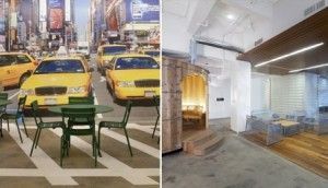 Oficinas de Google en Nueva York. (Imagen de: inc.com) Oficinas de Google en Nueva York. Como no podían faltar en este artículo, las oficinas de Google en el corazón comercial de Estados Unidos han sido descritas como un ‘paraíso nerd’: la decoración incluye códigos QR en los muros, antenas de Tv falsas y una sala sin ventanas a prueba de ruidos con una batería y guitarras eléctricas, además de un mural de cuerpo entero que recrea una intersección de la ciudad llena de taxis.