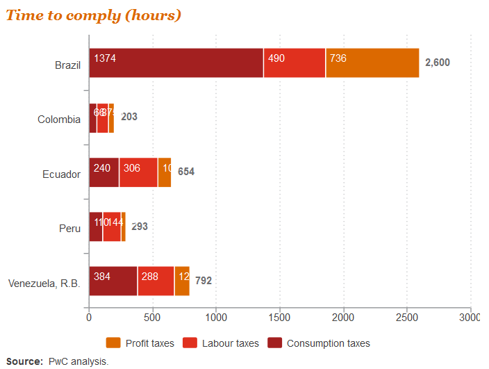 Todos esos procesos se llevan 654 horas cada año de los ecuatorianos laboralmente activos. En América Latina, el promedio en 2012 fue de 367 horas al año, aunque en la región está el país que más lentamente circula estos procesos en todo el mundo: Brasil, con 2.600 horas. Detrás de esta potencia económica del continente, en este rubro, vienen Bolivia, Venezuela y Ecuador.