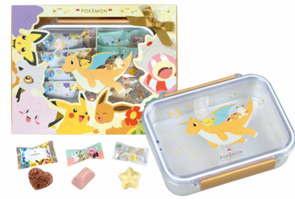 El juego de lonchera (1,650 yenes) te ofrece una lonchera transparente, con Pikachu, Eevee y Meowth montados en la espalda de Dragonite , para llevar tus comidas que no sean de postre.