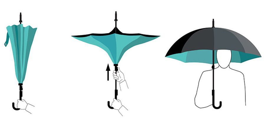 Se trata de KAZbrella, una nueva propuesta de Diseños KAZ, en Reino Unido, que invierte el mecanismo de apertura del paraguas tradicional para permitirle al usuario abrir y cerrar el paraguas en espacios reducidos, y mantener las gotas de agua en el interior del mismo al cerrarlo.