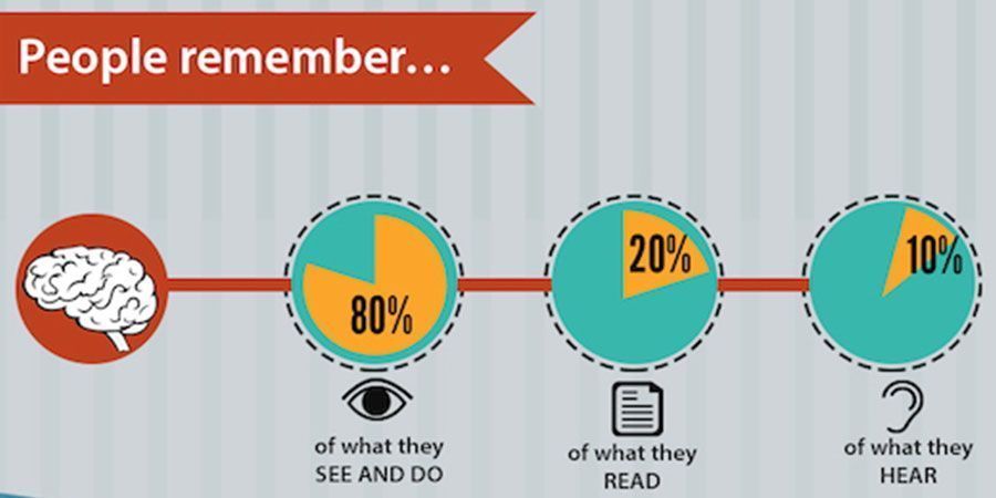Por eso es más común que la gente recuerde una imagen (80%) a un texto (20%) o sonido (10%); además porque es la información que más fácil se decodifca en el cerebro: Una imagen se procesa 60 mil veces más rápido que un texto.