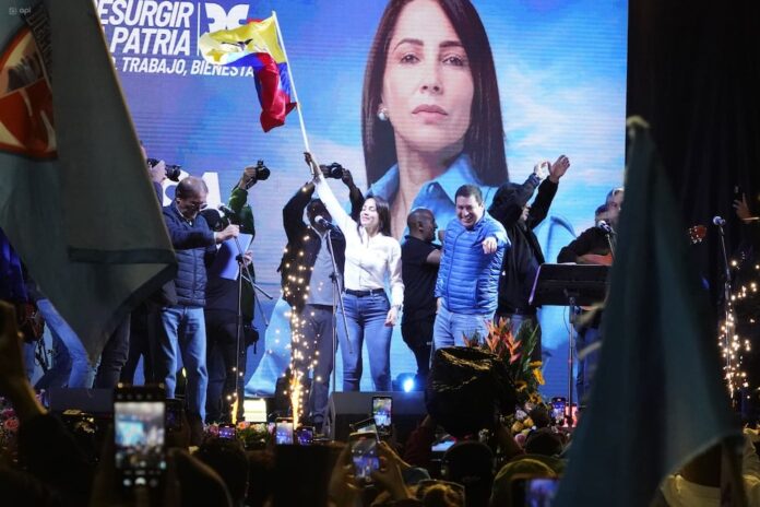 AME7667. QUITO (ECUADOR), 09/04/2025.- La candidata a la Presidencia Luisa González reacciona durante el evento de cierre de campaña este miércoles en Quito (Ecuador). González celebró que el excandidato presidencial Jan Topic, un exlegionario y empresario especialista en seguridad, se haya sumado a su «unidad» para formar un Gobierno amplio que integre varias tendencias y en el que eventualmente podría estar él. EFE/Santiago Fernández