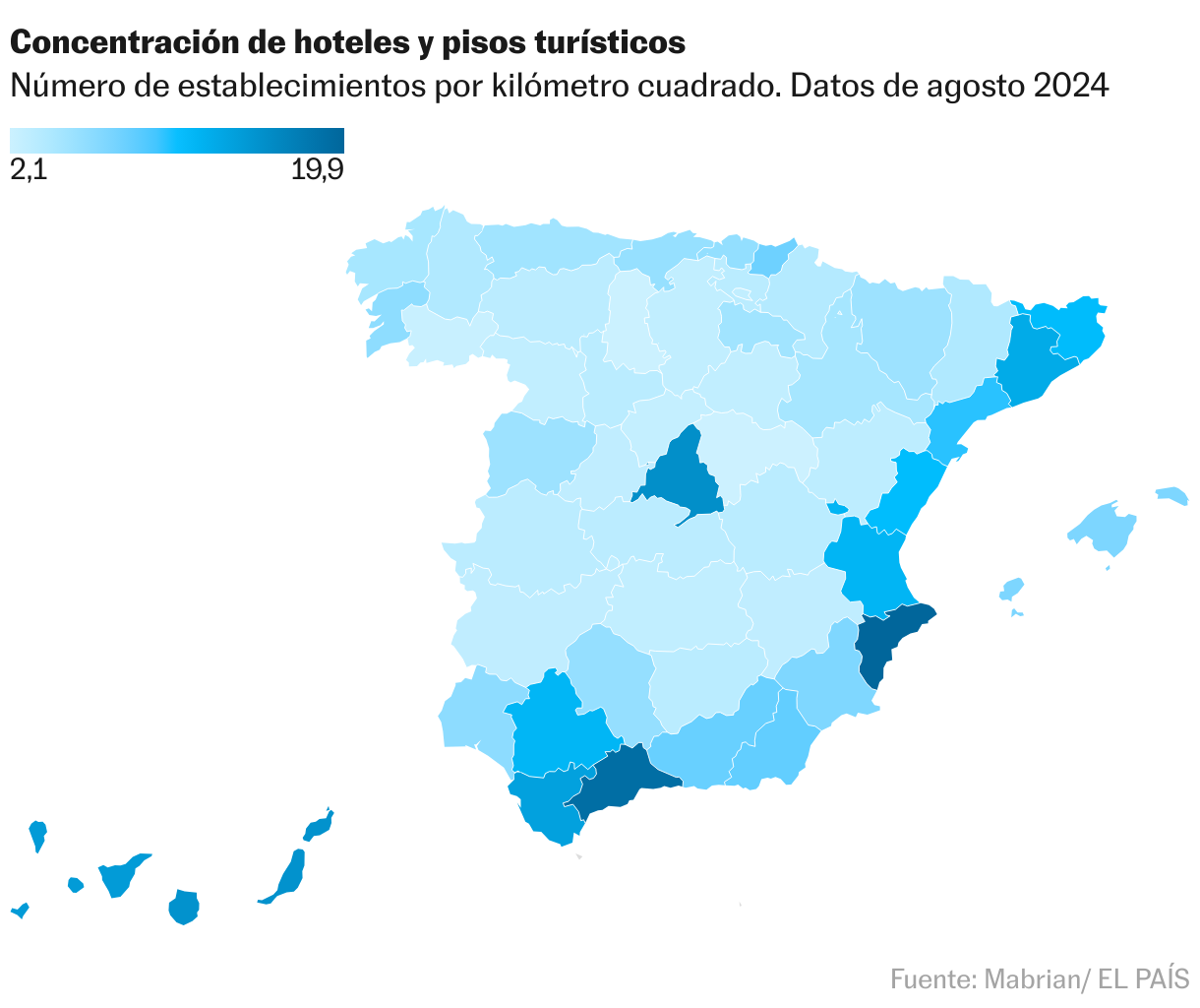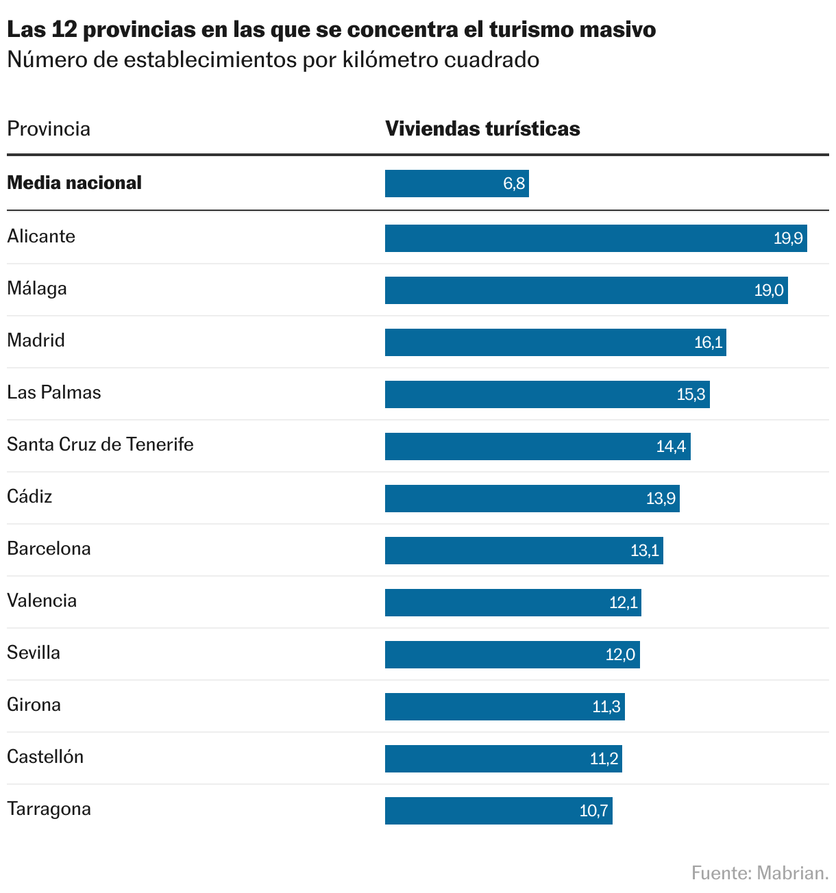 Das Phänomen der übermäßigen Konzentration von Reisenden ist weit verbreitet, wird jedoch in den meistbesuchten Zielen mit größerer Intensität reproduziert. Die Analyse durchgeführt von Die mabrianische Technologie, die auf Data Intelligence für den Tourismussektor spezialisiert istAusschließlich für das Land aus der Geolokalisierung der Unterkünfte, die von Reisenden (Wohnraum für Touristengebrauch und Hotels) in fünfzig spanischen Provinzen verwendet werden, zeigt, dass es zwölf von ihnen (Alicante, Valencia, Castellón, Málaga, Sevilla, Cádiz, Granada, Barcela, Madrid, Madrid, Madrid, Madrid und Madrid und Madrid, Madrid und Madrid und Madrid, Madrid, Madrid, und Madrid und Madrid und Madrid und Madrid, in Madrid, vorhanden sind. Ein sehr relevanter Bestandteil der Quellen, die für diesen Bericht konsultiert wurden, weist auf die Touristenböden als Hauptverantwortung für dieses Ungleichgewicht hin, wobei durchschnittlich 6,8 Häuser für jeden Quadratkilometer in Spanien in Spanien verantwortlich sind. Alicante und Málaga verdreifachen diese Zahl im Sommer (die Daten wurden am 15. August 2024 aufgenommen) und erreichten 19,9 und 19 Häuser pro Quadratkilometer. Sehr nahe an Madrid (16,1), Las Palmas (15,3), Santa Cruz de Tenerife (14,4), Cádiz (13,9), Barcelona (13,1), Valencia (12,1), Sevilla (12) und Girona (11,3).