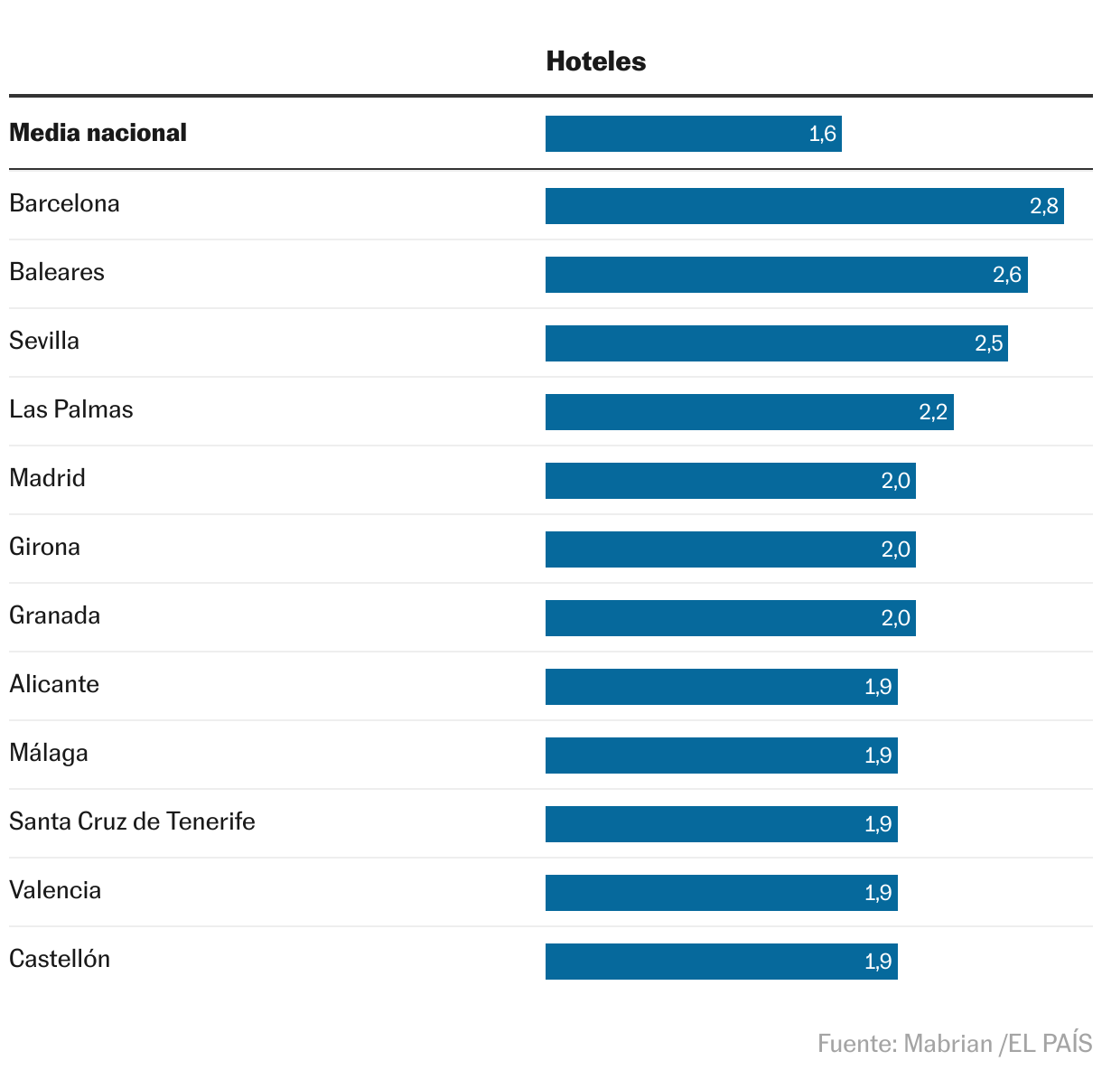 Obwohl die Zahlen für den Gebrauch von Touristen weniger dramatisch sind als bei der Wohnung, gibt es 17 Provinzen, die den nationalen Durchschnitt der Hotels (1,6 pro Quadratkilometer) überschreiten. Die höchsten Zahlen werden von Barcelona (2,8), Balearic Islands (2,6) und Sevilla (2,5) aufgezeichnet. Katalonien und die Balearic Islands sind die einzigen zwei Autonomien, die eine Touristenrate für über Nacht (Katalonien seit 2012 und die Balearic Islands seit 2016) und sowohl der Bürgermeister von Barcelona, Jaume Collboni als auch der Präsident der Balearic Islands, Marga Prohens, bereits angekündigt haben, sie erheblich zu erhöhen. Etwas, das die Hotelbranche empört hat, die ablehnt, dass es eine Hotelmessung gibt. «Wir wiederholen unsere absolute Opposition gegen die Zunahme von Nachhaltige Tourismussteuer. Jede zusätzliche Steuerbelastung wirkt sich direkt auf die Ausgabenkapazität von Touristen aus, insbesondere in Handel, Restaurierung und Freizeit “, sagt er Javier Vich, Präsident der Mallorca Hotel Federation und Vizepräsident der spanischen Konföderation von Hotels und Touristenunterkünften (CEHAT). Seiner Meinung nach ist es Zeit, mit Mut durch die öffentlichen Verwaltungen zu handeln. „Dies geht durch die Nicht -Neulinge der 92.000 Lizenzen, die in Mallorca in den letzten acht Jahren unter dem Modus der Ferienvermietung erteilt wurden. Sie wurden als vorübergehend geboren und konditioniert. Die soziale Realität in Bezug auf die Schwierigkeit des Zugangs zu Wohnraum motiviert, dass diese Genehmigungen verschwinden, die Gebrauch von Wohngebäuden wird wiederhergestellt und gibt keine wirtschaftliche Aktivität. “ Seiner Meinung nach ist es nicht die einzige Maßnahme, um das Wohnproblem zu lösen, «sondern das, mit dem Sie sofort Wohnungen freigeben können». Es sollte die intensive Verfolgung des illegalen Angebots vereinen.
