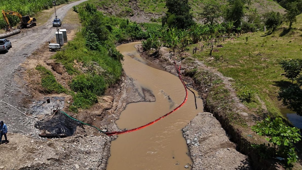 A orillas del río Viche, las barreras flotantes y las barreras absorbentes se utilizan para restaurar las trazas de hidrocarburos, y el trabajo continúa con la contribución del trabajo local.