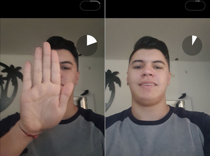 - Ahora sólo deberás pulsar para la foto, alejarte, mirar a la pantalla y cuando estés listo mostrar la palma de la mano o usar el comando de voz para tomar la selfie.