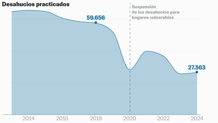 Esta delicada situación financiera de muchos inquilinos, que se enfrentan a un mercado en que los precios casi se han duplicado en el último decenio, se traslada al número de desalojos, que han crecido en los últimos tiempo. En 2024 (los datos de 2025 aún no se conocen) se practicaron 27.564, un 3,4% más que en 2023, de acuerdo con el Consejo General del Poder Judicial (CGPJ). La cifra, sin embargo, queda muy por debajo de los más de 60.000 que se ejecutaban anualmente en los años que siguieron a la Gran Recesión.