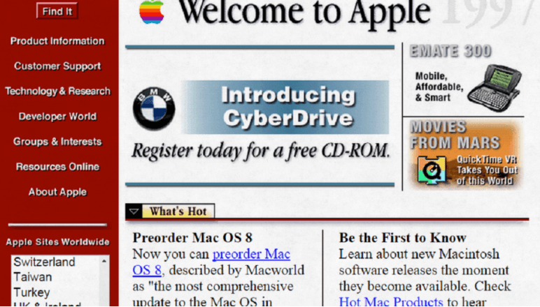 En julio de 1997, dos semanas después de que Steve Jobs se haga cargo de Apple, el portal digital de la empresa lucía así.