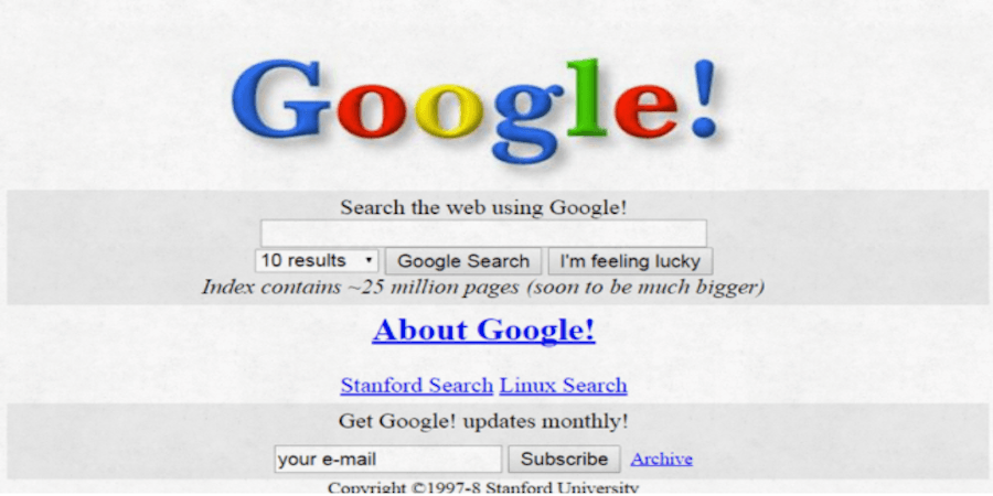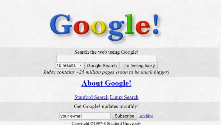 Google tenía apenas un año de creación y fue elaborada como un proyecto de investigación manejado por Larry Page y Sergey Brin, estudiantes de la Universidad de Stanford. Actualmente se ha convertido en una de las plataformas digitales más importantes del mundo, sin embargo, todavía mantiene su imagen neutra y sin mucho contenido.