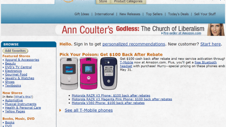 El sitio web de Amazon había permanecido igual durante 17 años hasta que finalmente, en octubre del 2014, se deshizo de su herramienta de navegación ubicada a un lado de la pantalla.