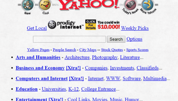 Yahoo inició en 1994 como «La Guía de Jerry y David para Internet», una lista de sitios web organizados por categoría y que fue elaborado por estudiantes de la Universidad de Standford.