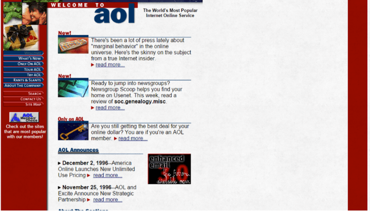El sitio de AOL surgió en 1990 como una página alternativa. AOL fue una de las primeras páginas de Internet.