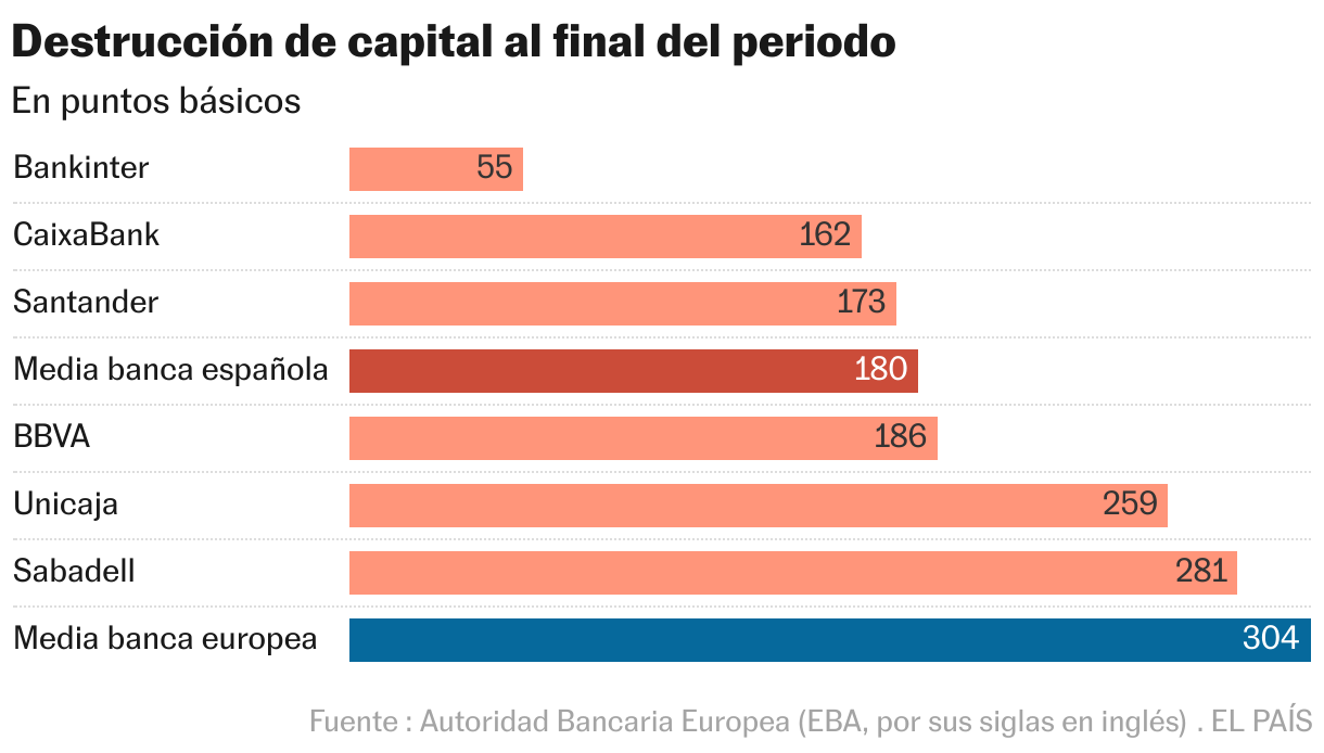 La banca española presume de solvencia. En un hipotético entorno de fuerte contracción económica, repunte del desempleo, caídas en los precios inmobiliarios y elevada volatilidad financiera, los bancos españoles consumirían 180 puntos básicos de capital, lo que supone una de las cifras más bajas de entre los países europeos comparables, según los test de estrés que ha publicado este viernes la Autoridad Bancaria Europea (EBA, por sus siglas en inglés). La media europea es de 304 puntos básicos.