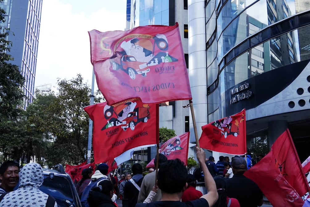 Sindicatos de trabajadores realizaron un nuevo plantón en los exteriores del Ministerio del Trabajo, en Quito, Los Angeles tarde de este jueves, 24 de julio de 2025.