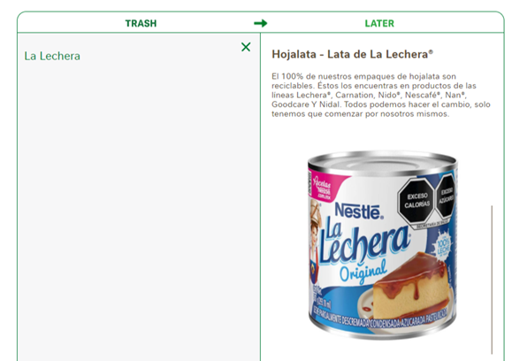 Por ejemplo, si para el desayuno familiar preparaste hot cakes acompañados con un poco de La Lechera®, y no sabes cómo reutilizar la lata, escribe “Lechera” u “hojalata” en el buscador del traductor de basura para conocer las acciones sustentables a detalle.