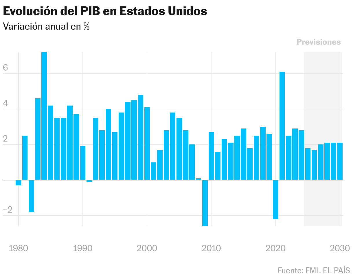 La última vez que se equilibró el presupuesto y se redujo la deuda fue durante la presidencia de Bill Clinton, que se atrevió a vaticinar en diciembre de 2000 que Estados Unidos estaría libre de deuda en una década. Desde entonces, las rebajas de impuestos, la Gran Recesión y la pandemia han provocado altos déficits. La llamada deuda en manos del público —ese dato es más relevante que la deuda bruta, dada la gran cantidad de pasivo intragubernamental— cerró 2024 en el 98% del PIB.