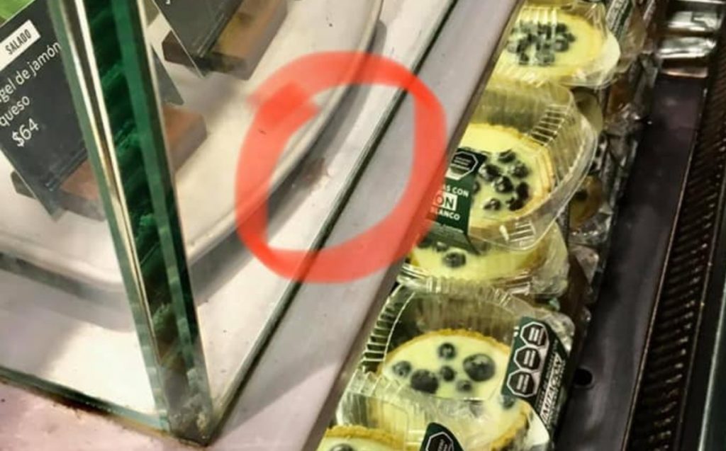 Donde se denunció con una imagen, la presencia del insecto al interior de la vitrina en la que se exhibe panadería y alimentos de la marca.